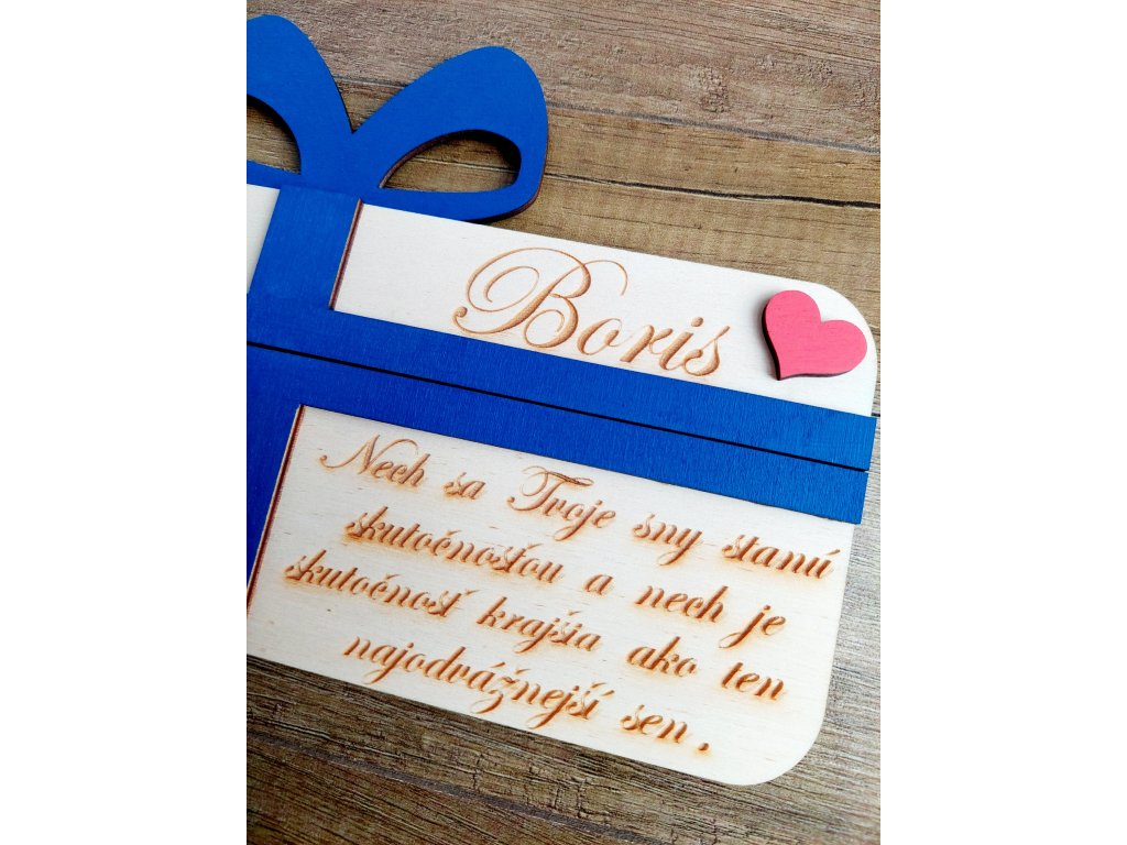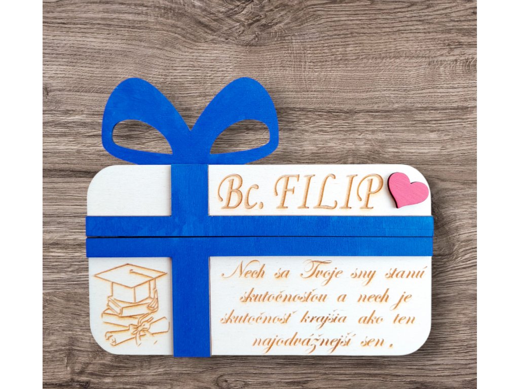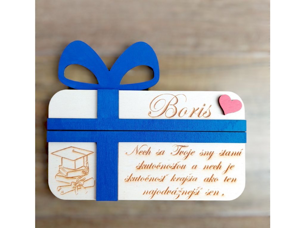 Drevená obálka na peniažky alebo poukážky k promóciam s nápisom alebo s textom podľa Vášho želania