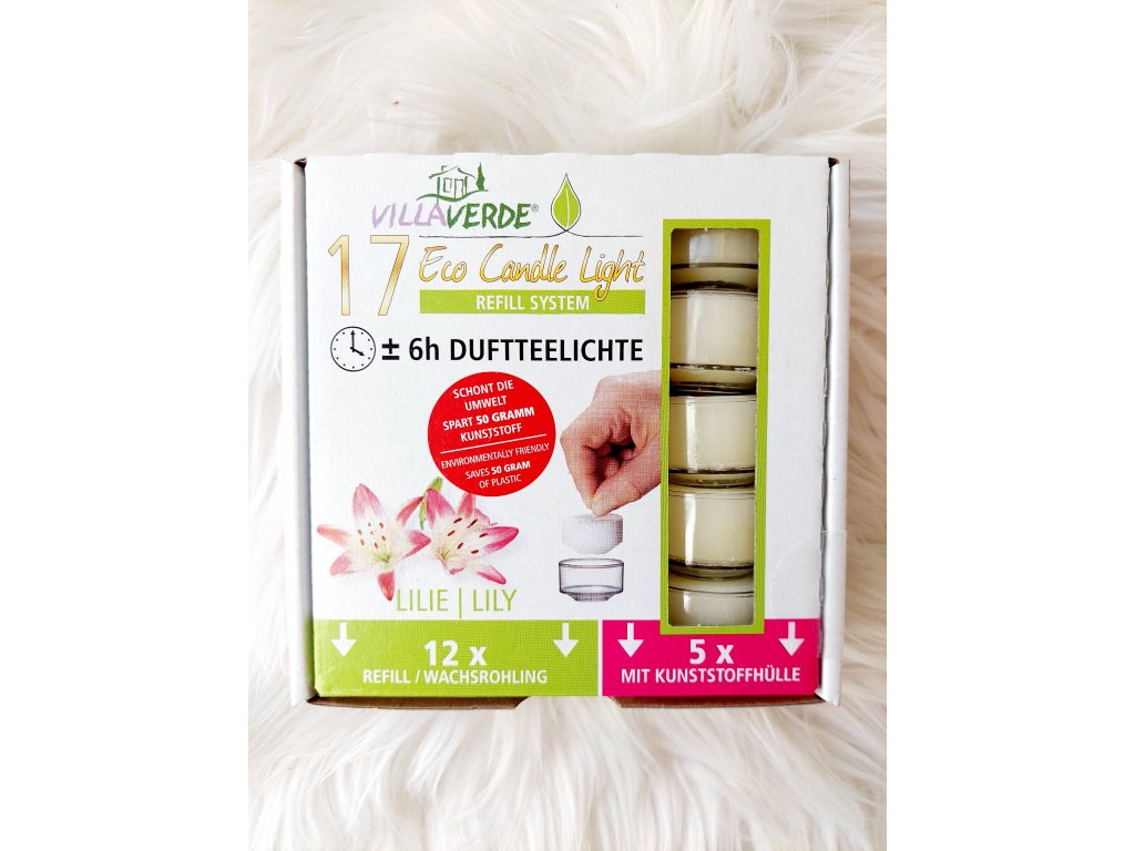 Umožňujú opakované použitie tej istej misky. Tento produkt má pozitívny vplyv na životné prostredie, šetríme hliník a plasty, ktoré sú po spálení odpadom. Jedno malé balenie ušetrí 75 gramov plastu. Spoločne môžeme zachrániť tisíce ton plastov a hliníka vyhodených do odpadu. Sviečky Eco Candle Light horia 6 hodín a poskytujú o 175 % viac svetla ako bežné čajové sviečky.
