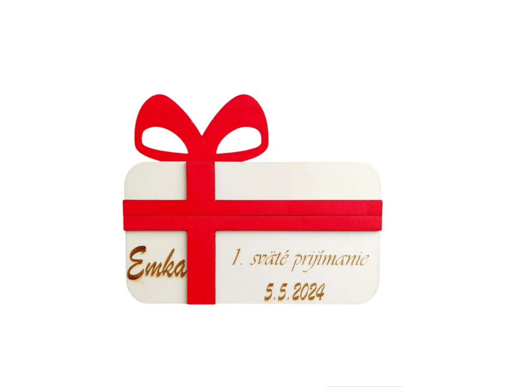 Originálna drevená obálka na peniažky alebo poukážky v červenej farbe, navrhnutá špeciálne pri príležitosti 1. svätého prijímania.
