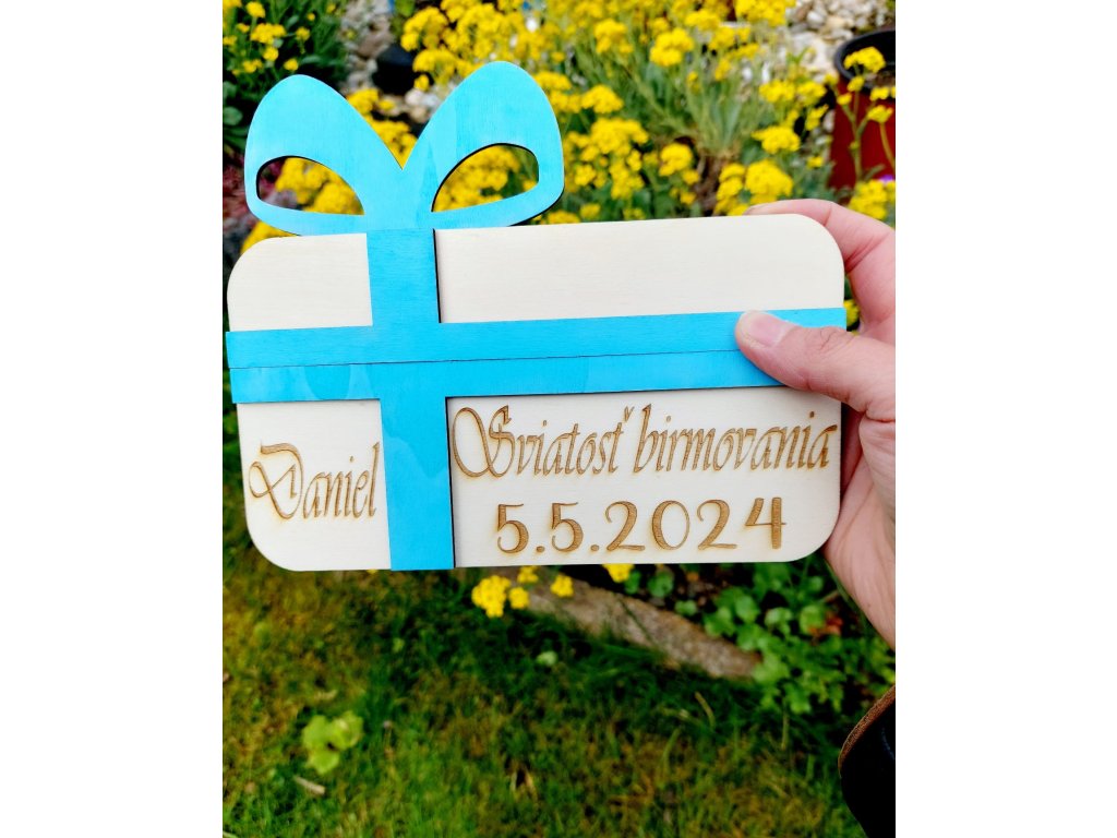 Originálna drevená obálka na peniažky alebo poukaz vytvorená pri príležitosti sviatosti birmovania.