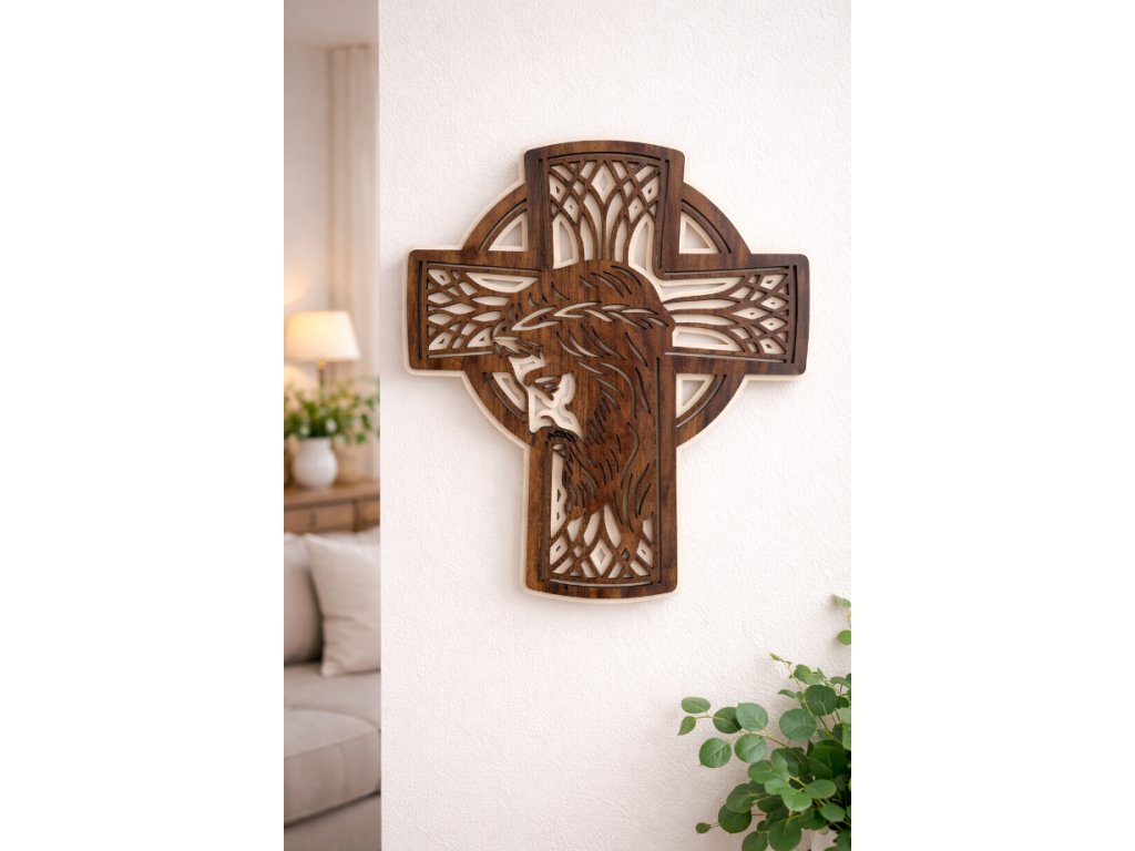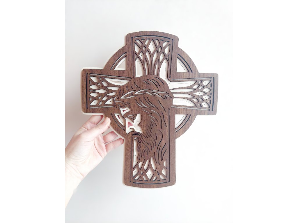 ✝️ Drevený dvojvrstvový kríž s motívom Ježiša - 30 × 26 cm