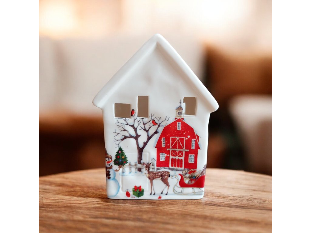 Domček zdobí detailná zimná potlač - červená stodola, stromček, jeleň a sane.