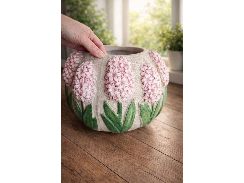 Dekoratívny obal na kvetináč s reliéfom ružových kvetov hortenzie, ktorý okamžite upúta pozornosť svojím jemným romantickým dizajnom.