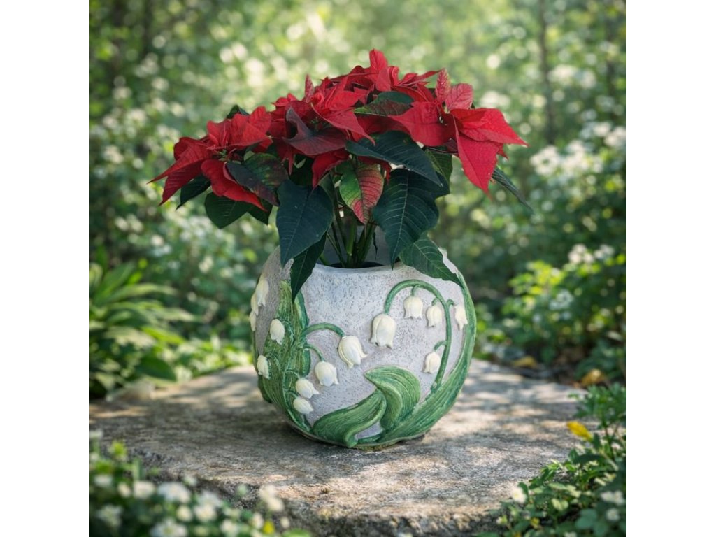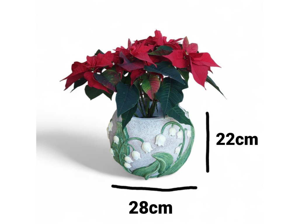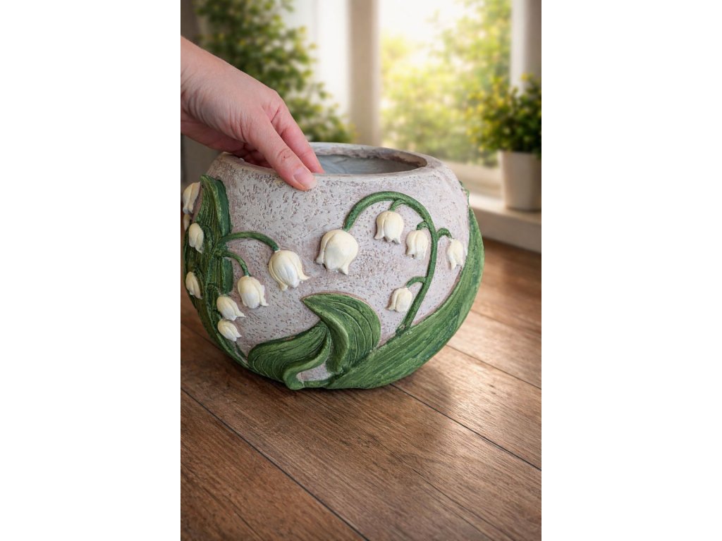 Dekoratívny obal na kvetináč s motívom konvaliniek je výrazný a elegantný doplnok, ktorý okamžite upúta pozornosť.