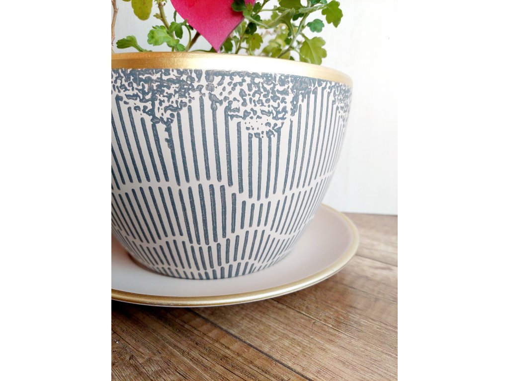 Matný povrch v kombinácii s jemným dekoratívnym vzorom a zlatým lemovaním pôsobí luxusne, moderne a nadčasovo.