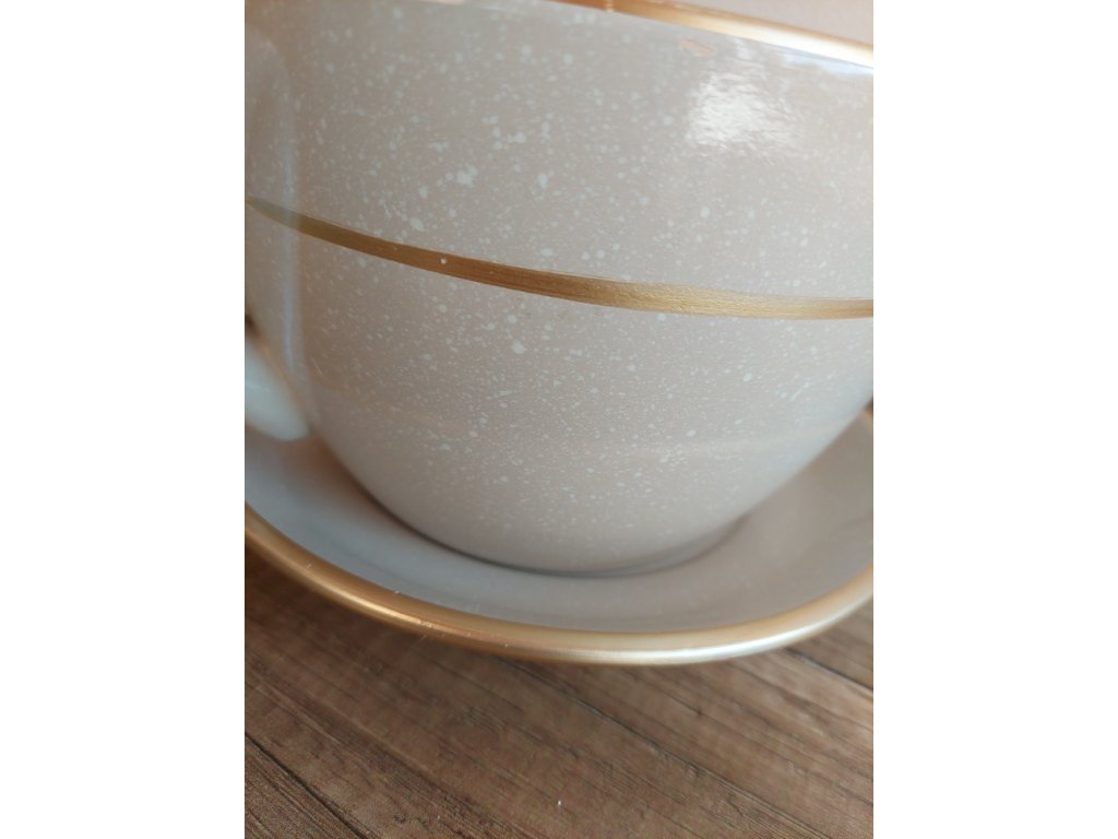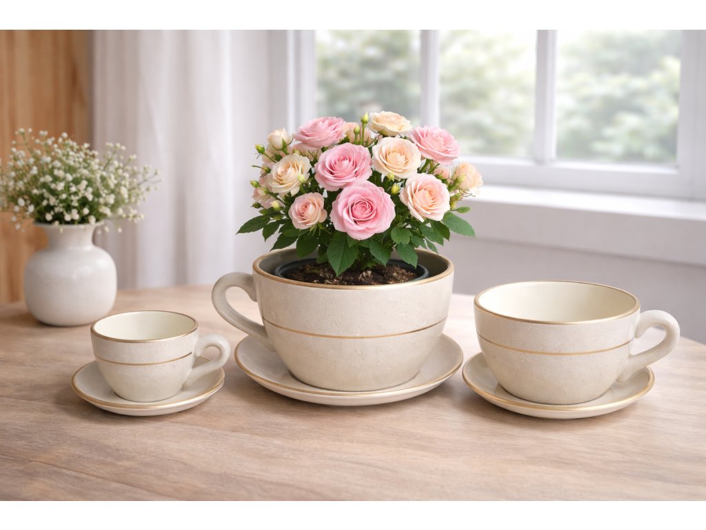 Elegantný keramický kvetináč v tvare šálky s tanierikom v jemnom béžovom prevedení so zlatými detailmi je štýlovým doplnkom do každého interiéru.