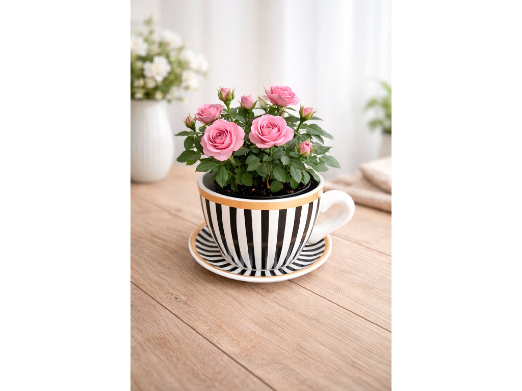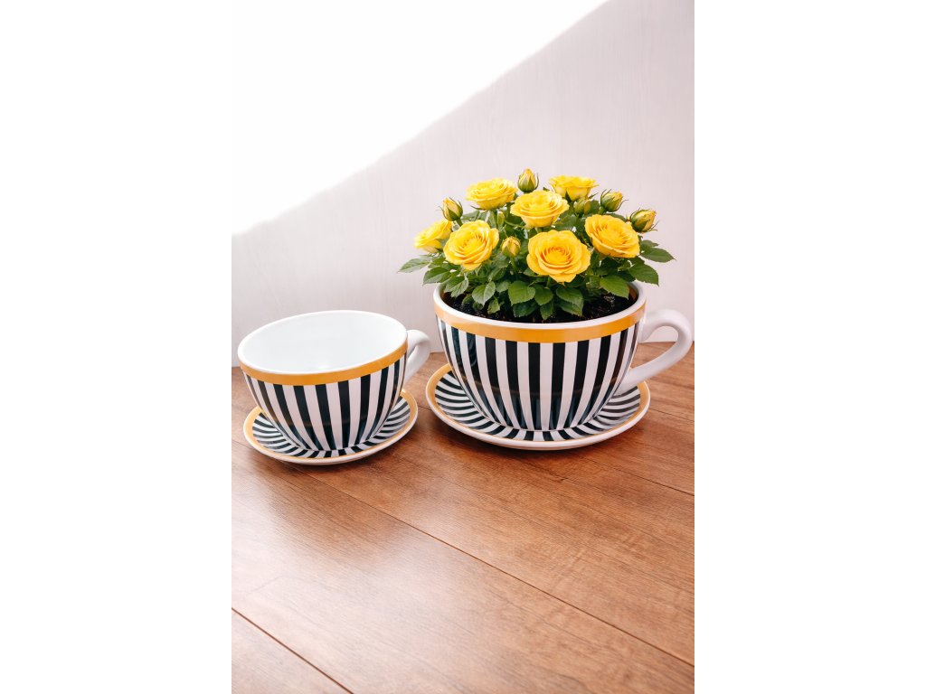 Štýlový keramický kvetináč v tvare šálky s podšálkou v elegantnom bielo-čiernom pásikavom prevedení so zlatým lemom je výrazným doplnkom do moderného aj klasického interiéru.