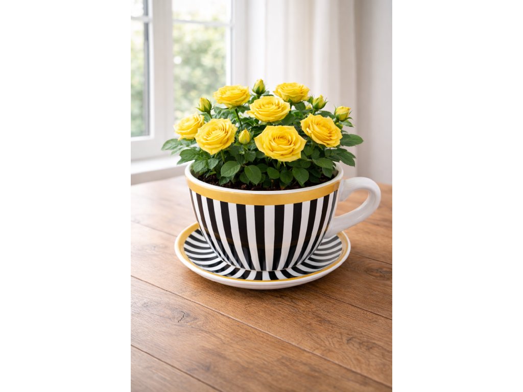 Štýlový keramický kvetináč v tvare šálky s podšálkou v elegantnom bielo-čiernom pásikavom prevedení so zlatým lemom je výrazným doplnkom do moderného aj klasického interiéru.