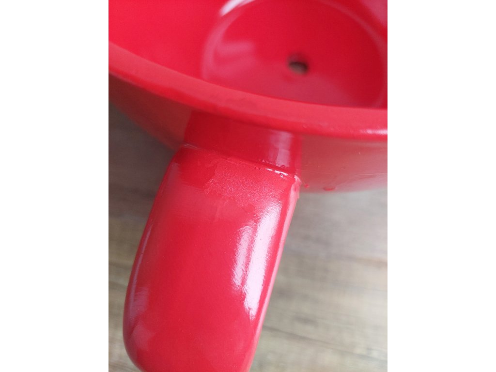 – na ušku šálky sú viditeľné drobné odreniny a glazúrové nerovnosti – tzv. "stekance" od farby a drobné povrchové chyby vzniknuté už vo výrobe (viď detailné foto).