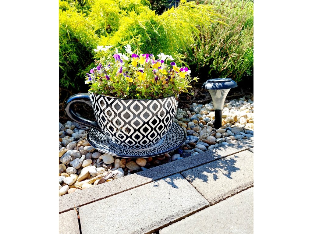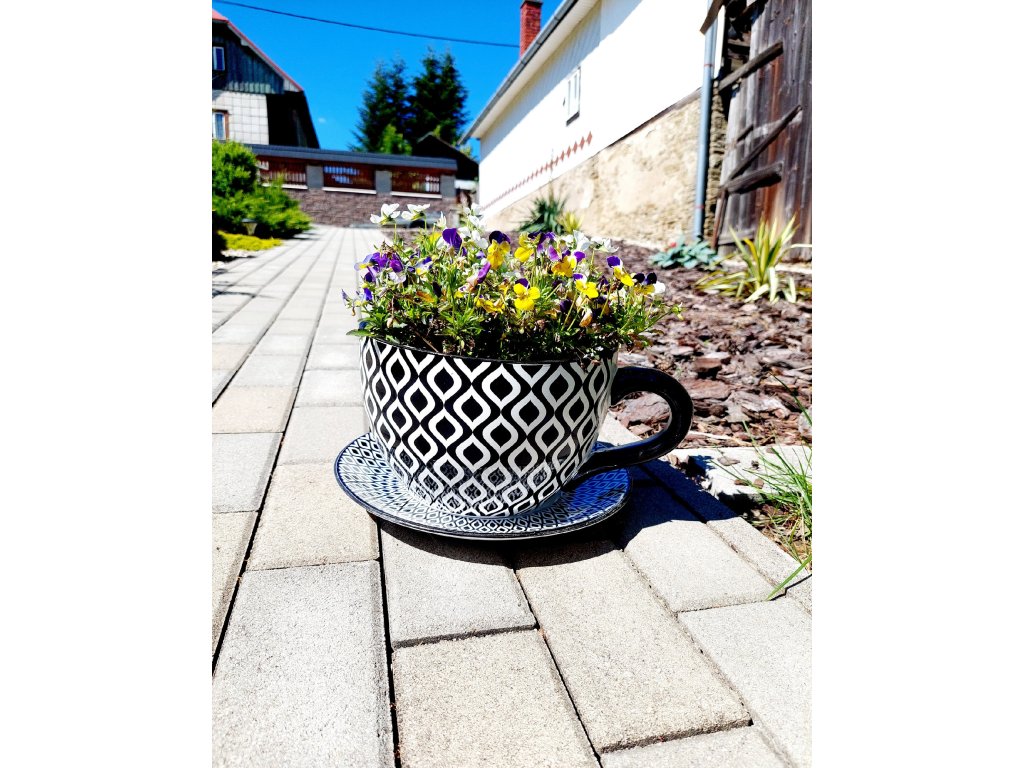 Kvetináč - táto obria šálka s podšálkou Čiernobiela má celkovú šírku aj s uchom až 30 cm.