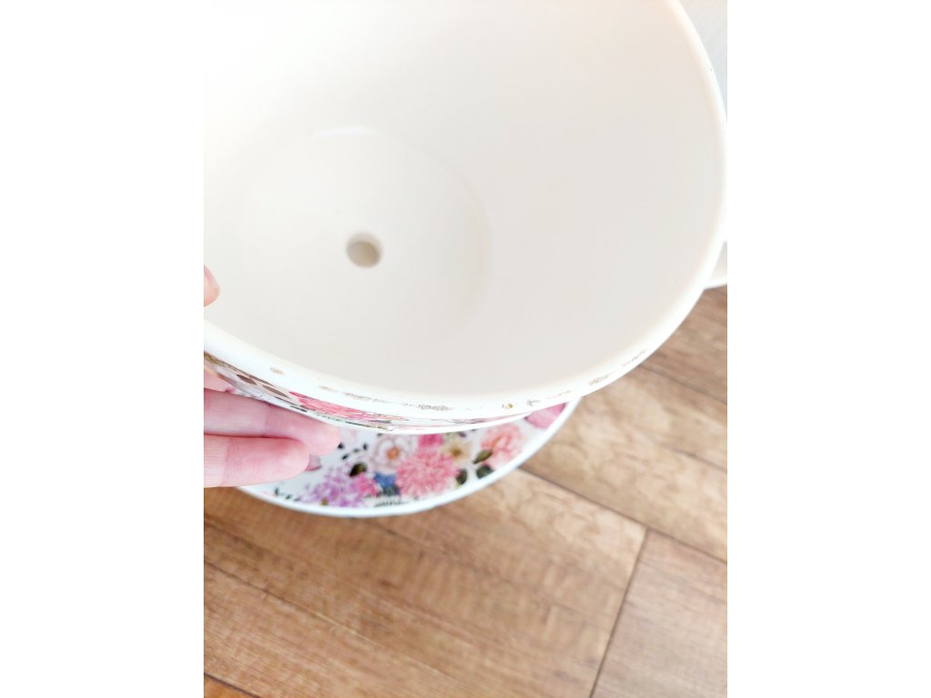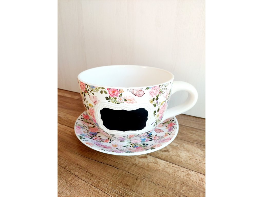 Krásna veľká keramická šálka s podšálkou s jemným motívom kvetov a motýľov, vhodná ako kvetináč na kvety alebo dekorácia do domu, na terasu či balkón.